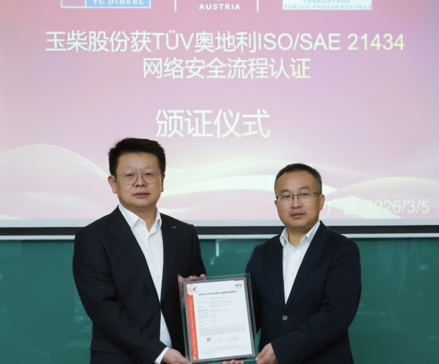 TÜV奥地利向玉柴集团颁发ISO/SAE 21434汽车网络安全流程认证证书,为智能动力产品走向全球市场筑牢了安全基石。